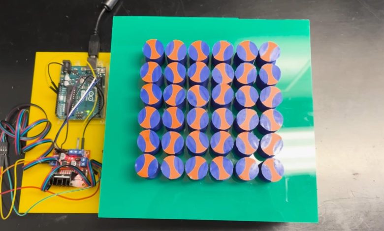 Материал, созданный в лаборатории Wave Engineering for eXtreme and Intelligent maTErials (We-Xite) под руководством профессора Осамы Билала, представляет собой решётку 11x11 из асимметричных столбов. Каждый столб имеет одну или несколько вогнутых граней, напоминающих по форме сердцевину яблока, и может индивидуально поворачиваться с шагом в один градус с помощью моторов. Именно переориентация этих столбов позволяет перестраивать функционал материала на лету. Звуковые волны, проходя через решётку, особым образом отражаются от вогнутых поверхностей, и, управляя углами поворота, можно заставить материал фокусировать, поглощать или перенаправлять звук.