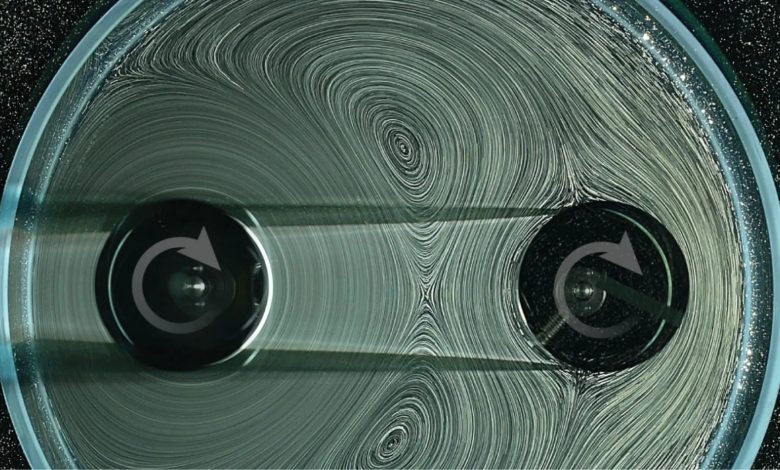 Эксперименты подтвердили эту гипотезу. В серии опытов два цилиндра погружались в вязкую смесь воды и глицерина. При вращении первого цилиндра-ротора окружающая жидкость начинала интенсивное движение. Оказалось, что поведение системы кардинально меняется в зависимости от расстояния между цилиндрами. На близкой дистанции жидкость действует как микроскопические зубья, толкая второй цилиндр и заставляя его вращаться в противоположном направлении, подобно шестерням в механических часах. Если же цилиндры раздвинуть, жидкость начинает обтекать второй ротор, как невидимый ремень, увлекая его вращение в том же направлении.